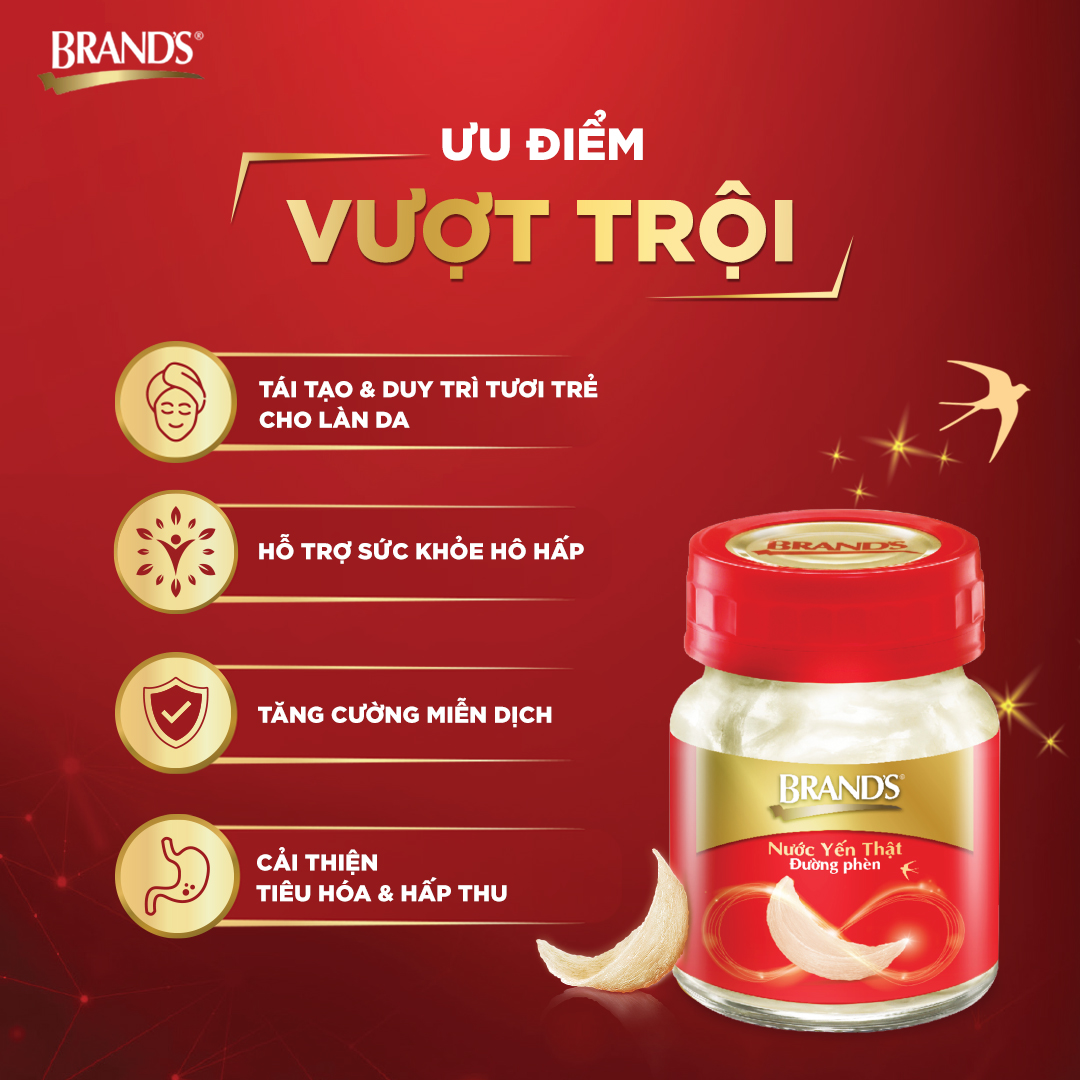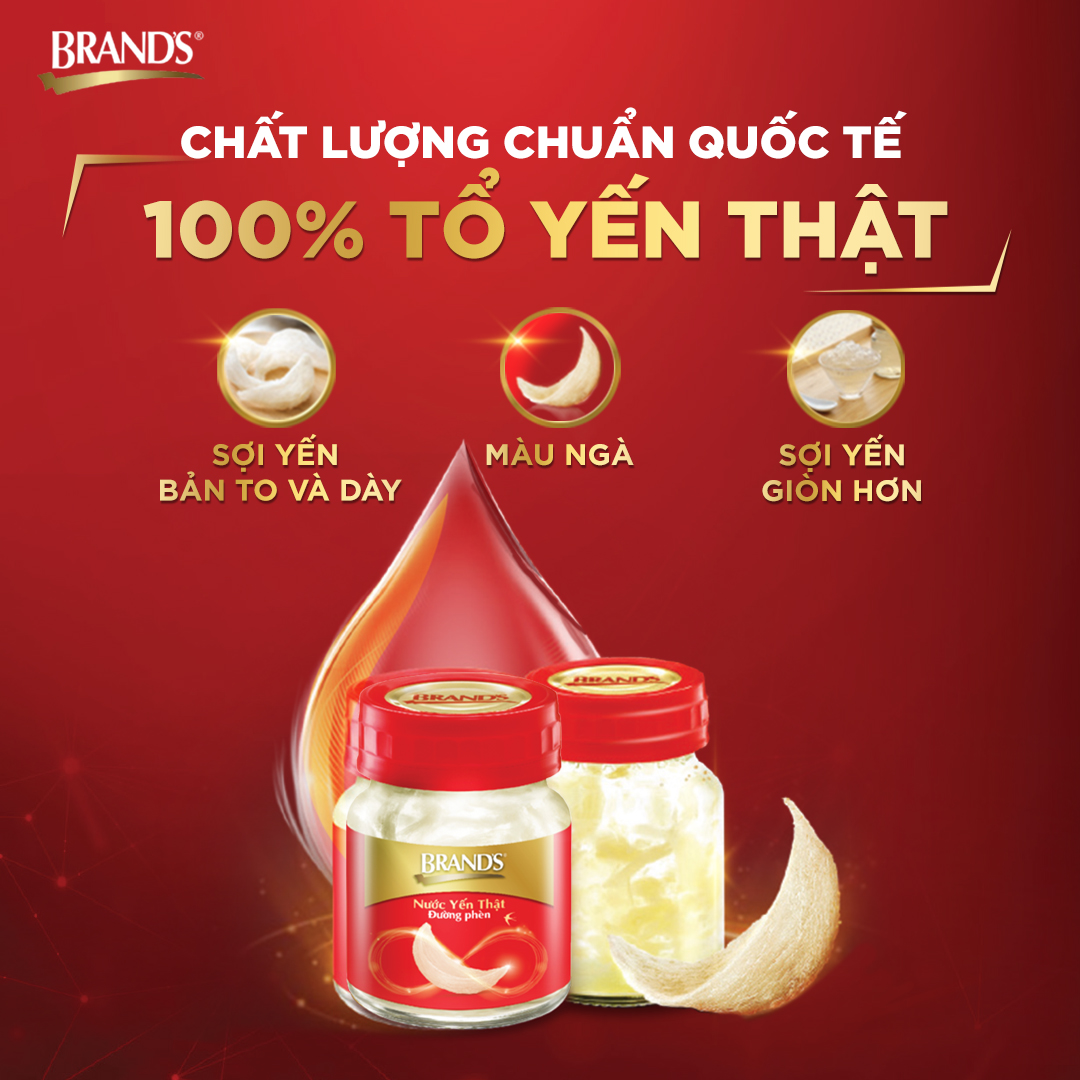 Nước yến thật BRAND'S Không Đường được chế biến từ tổ yến thật 100% cao cấp, được làm sạch tỉ mỉ bằng tay và kiểm chứng bằng công nghệ quang phổ độc đáo. Sản phẩm là sự kết hợp hoàn hảo giữa công thức cổ truyền với các tiêu chuẩn cao trong sản xuất hiện đại nhằm đảm bảo chất lượng tốt đến tay người tiêu dùng. Những dưỡng chất quý giá chắt lọc trong từng lọ nước yến mang lại cho bạn nhiều lợi ích sức khỏe, thích hợp để thưởng thức mỗi ngày.