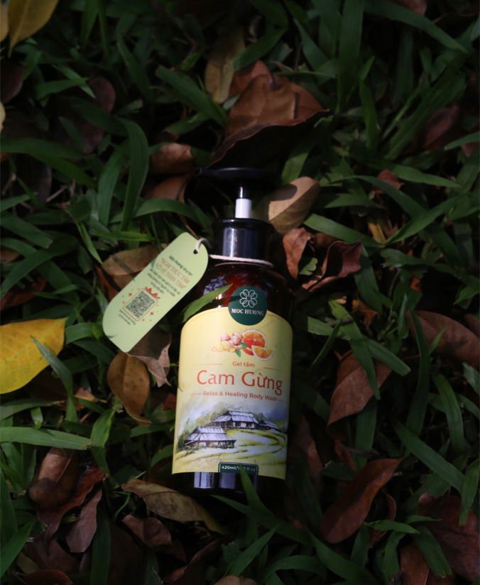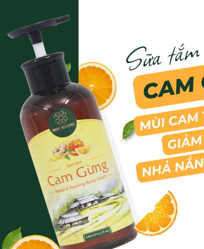 Kết hợp Vitamin C tự nhiên từ Cam và tinh dầu Gừng ré Bắc Kạn cô đặc gấp 100 lần so với gừng tươi bằng công nghệ CO₂ siêu tới hạn, Gel tắm thảo dược cao cấp Cam - Gừng Mộc Hương giúp chống oxy hóa, làm dịu tác động của tia UV, làm sáng và đều màu da, đồng thời giữ ấm, giảm mệt mỏi và mang lại hương thơm tươi sáng, đầy năng lượng.