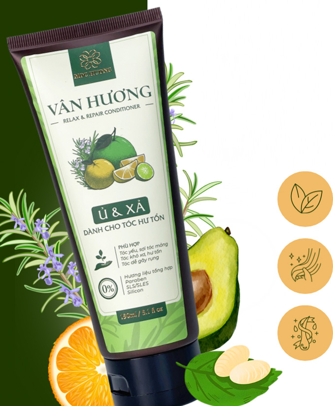 Kem Ủ & Xả tóc Vân Hương là giải pháp từ thiên nhiên giúp phục hồi tóc yếu, dưỡng mềm, chắc khỏe và bảo vệ mái tóc khỏi tác hại của môi trường nắng nóng, khói bụi với sự kết hợp của dầu quả bơ và protein tơ tằm (chiết xuất từ kén tằm tự nhiên). Cùng với đó là mùi thơm dịu nhẹ nhờ vào tinh dầu thiên nhiên như cam, hương thảo.